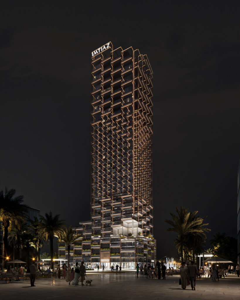 Os apartamentos contam com espaços externos ao longo da torre de 42 andares. Os detalhes do design estão firmemente enraizados nas tradições locais. “A estrutura entrelaçada confere um ritmo e uma textura distintos a cada fachada, emulando o padrão intrincado e o artesanato do bordado feito pelos artesãos tradicionais do Emirado”, destaca o estúdio Zaha Hadid Architects
