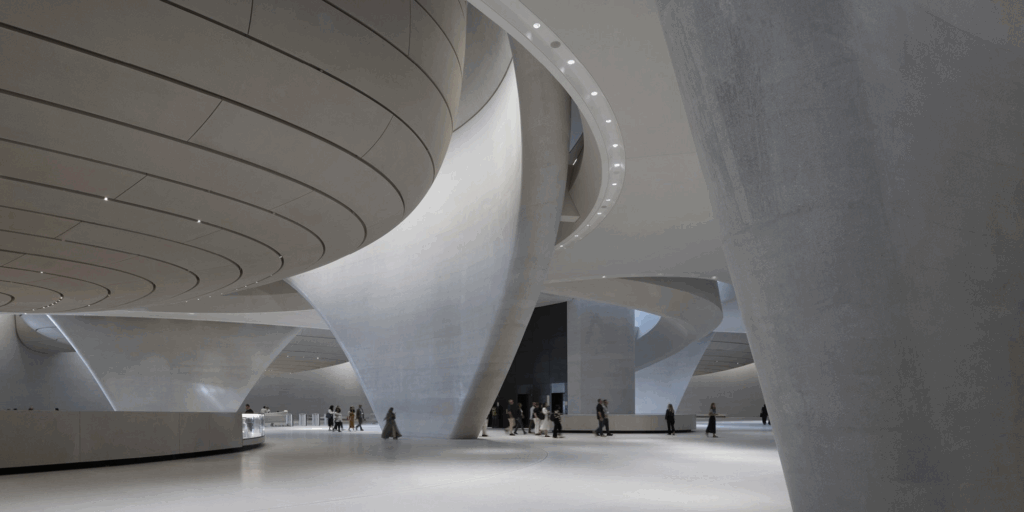 Os visitantes podem escolher o seu próprio percurso pelas diferentes galerias e seguir para o nível superior através de uma escada em espiral escultural ou elevadores.