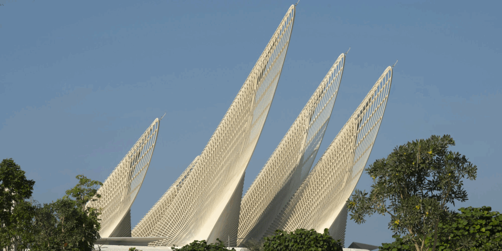 A arquitetura e o design sustentável do novo edifício cultural destacam-se na forma e ainda pelas cinco asas de aço leve do museu que fazem parte do sistema de ventilação natural.