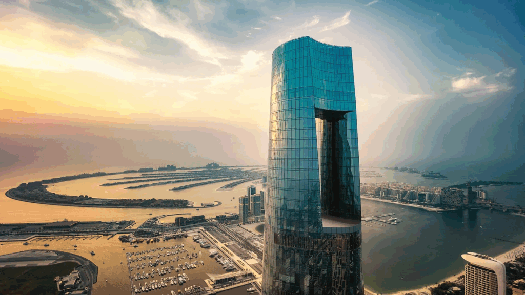 A estrutura do hotel em forma de agulha foi projetada pelos arquitetos do NORR Group e tudo gira em torno da altura. Todos os quartos têm janelas do chão ao teto para aproveitar as vistas panorâmicas sobre a Palm Jumeirah, o horizonte urbano de Dubai e o Golfo Arábico.