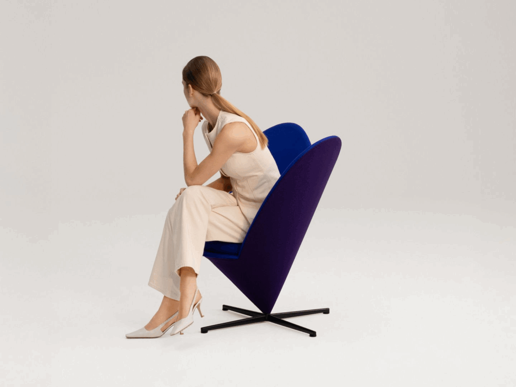 Pouco tempo depois, Panton levou esta ideia mais longe ao desenvolver a Heart Cone Chair. O encosto em forma de coração juntava conforto e liberdade de movimentos com uma silhueta icónica. O design mostra o fascínio de Panton pela geometria e o seu objetivo de unir funcionalidade e impacto emocional. A Cone Chair e a Heart Cone Chair tornaram-se rapidamente ícones do design moderno, incorporando a linguagem estética única de Panton”.