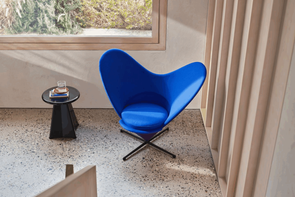 Para assinalar o 100.º aniversário do nascimento do prestigiado arquiteto e designer dinamarquês Verner Panton, no dia 13 de fevereiro de 2026, a Vitra e a Verner Panton Design AG lançaram uma edição limitada da Heart Cone Chair, a icónica cadeira que assume uma versão bicolor. A frente e a parte traseira da cadeira apresentam dois tons diferentes de azul, conferindo ainda mais vida à sua forma já expressiva e transformando a Heart Cone Chair numa peça de destaque em qualquer espaço interior.