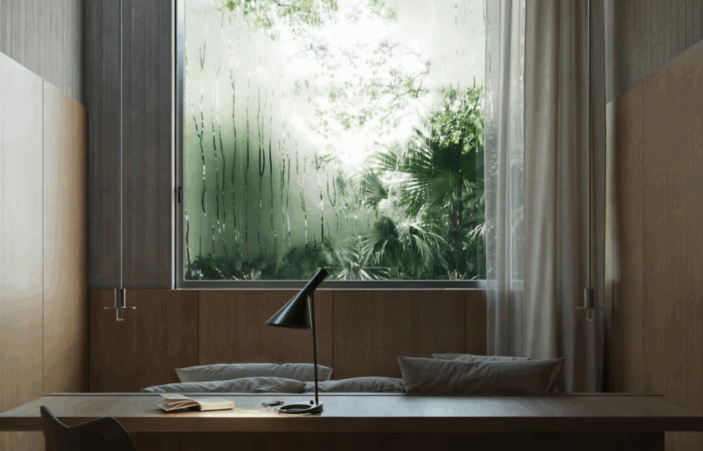 A natureza envolvente à casa proposta pelos arquitetos portugueses emerge na “condição de lentidão e persistência”. Os materiais foram “escolhidos para envelhecer, para escurecer, para registar a chuva e a humidade”, lê-se ainda na descrição do projeto.